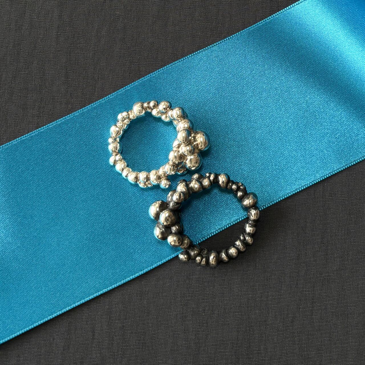 水滴をたくさん集めたようなフォルムの、ずっしりとボリューム感のあるリングです。
